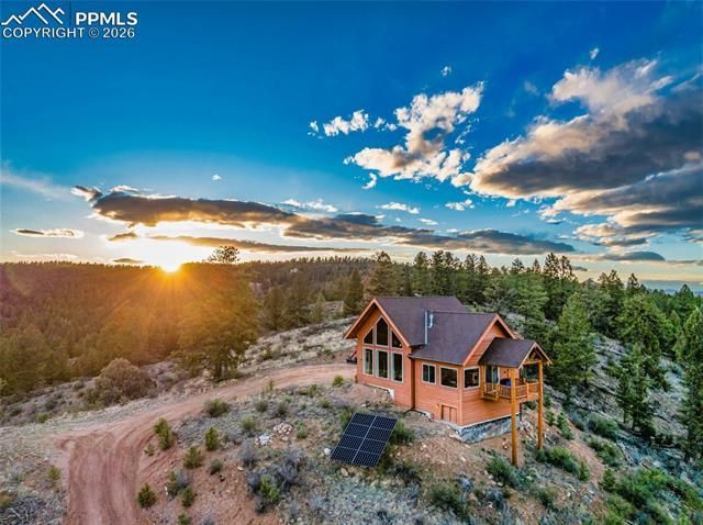 49.64 acres. Completely off-grid. Just 52 feet from the Pike National Forest. Spectacular 360-degree mountain views in every direction. This is the Colorado mountain property you have been searching for. Tucked away with total privacy yet only 10 minutes from downtown Woodland Park, this 2 bedroom, 1 bathroom, 1,480 square foot off-grid home sits on nearly 50 acres of pristine Teller County land. Whether you are looking for a mountain retreat, a homestead, or a forever home surrounded by nature, this property delivers on every level. Step inside to find hand-peeled beams and custom woodwork throughout, a stunning two-sided gas fireplace, and the warmth of true mountain craftsmanship. The home was constructed with green built structural insulated panels for superior energy efficiency, finished with durable Hardyboard siding and equipped with lightning protection on the roof. The off-grid power system has been fully upgraded with a 24-volt solar array featuring new panels, a new inverter, and three new lithium ion batteries. A backup generator and on-site propane provide additional reliability year-round. The well produces an exceptional 7 gallons per minute, and Starlink satellite internet is included for high-speed connectivity in even the most remote settings. Outside, the land is nothing short of breathtaking. Live water flows through the property along a creek, attracting abundant Colorado wildlife including moose, bear, elk, and deer. With direct access to National Forest trails from your doorstep, this is a paradise for hiking, hunting, horseback riding, and outdoor recreation in the Pikes Peak region. This is one of the most unique off-grid properties for sale near Woodland Park, Colorado. Seller is willing to negotiate on furnishings and a tractor to make this a truly turnkey mountain living experience. Schedule your private showing today.